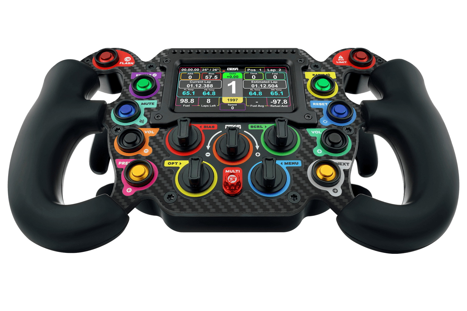 The Formula Pro Elite is a full featured sim steering wheel. Using only the finest materials and construction, the feeling is nothing short of rock solid immersion. No flex, no compromises. The wheel is constructed from 3 core materials: 5mm Carbon Fiber in Matte Twill, 6061 Aluminum, and Direct-Injection Silicone Rubber handles for maximum grip and comfort. It also features a High-Res LCD Touchscreen and RGB LED Rev Lights which can be customized within all of today’s popular sim software. This is the perfect wheel for the no-compromises sim racer.