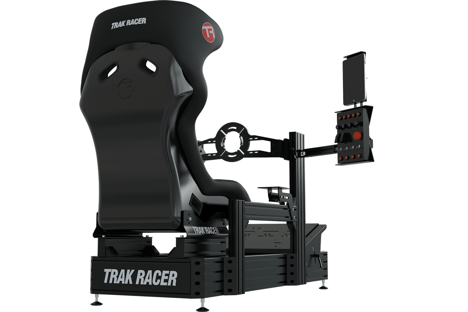 The Trak Racer tablet and button box upgrade kit has been designed to mount on any DIY sim rig with T-Slot. It includes 2 pivot points to enable it to swivel. Unlike others on the market, it's universal without the need for mounting holes on the back of your button box. OMounts to all DIY aluminium sim rigs and conveniently places your buttonbox and tablet to the left or right side of the wheel mount. Heavy and durable construction, painted/anodized in black. Fully adjustable to fit most tablets and button boxes. Constructed from laser cut carbon steel and aluminium. Direct fitment with all mounting screws/nuts included.